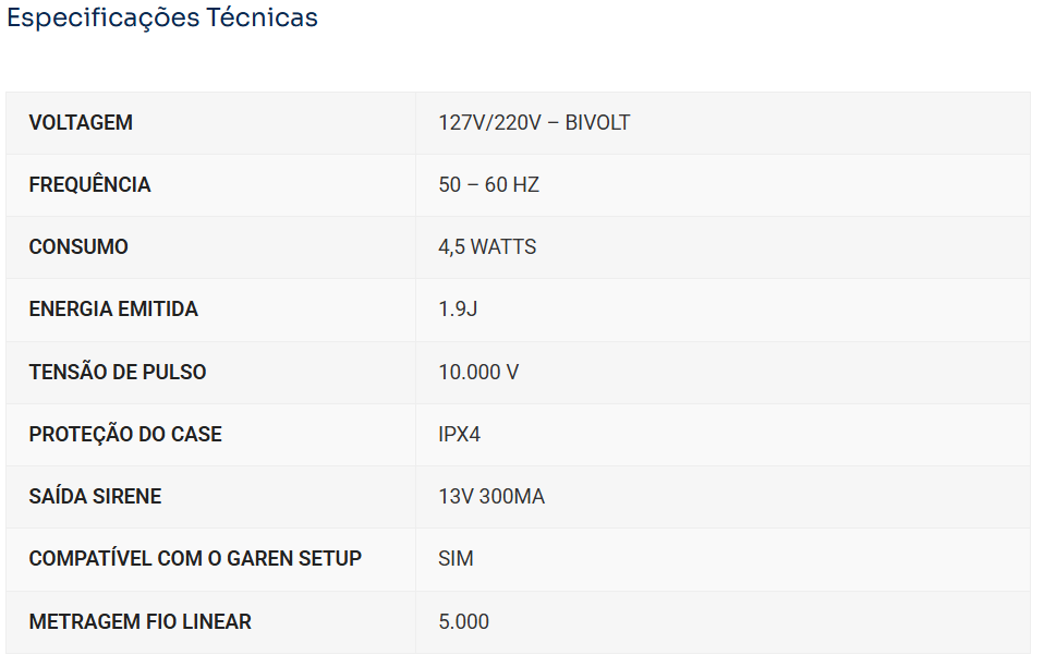 Permite alimentar até 5.000 metros de fio linear e conta com tensão de choque 10.000V,  proporcionando funcionamento de alta potência.